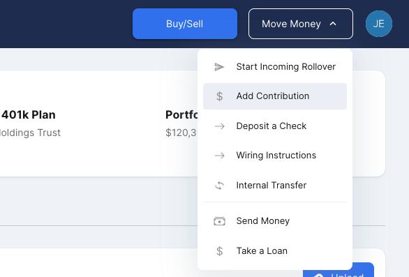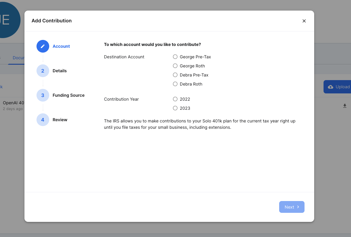 Make contributions in-app with a few clicks. Choose your destination account (Traditional vs Roth) and your amount, link your bank accounts, and complete the contribution.